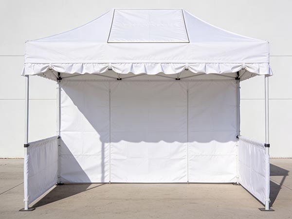 Dachplane: vollflächig bedruckbar, einseitig (Außenseite). Volant: der umlaufende Rand unterhalb der Dachplane, bedruckbar auf der Außenseite. Seitenwände: in zwei Höhen erhältlich (Halbwand und Vollwand), bedruckbar außen und auf Wunsch auch innen. Seitenwand mit Tür oder Fenster: bedruckbar auf den Flächen neben dem Ausschnitt.