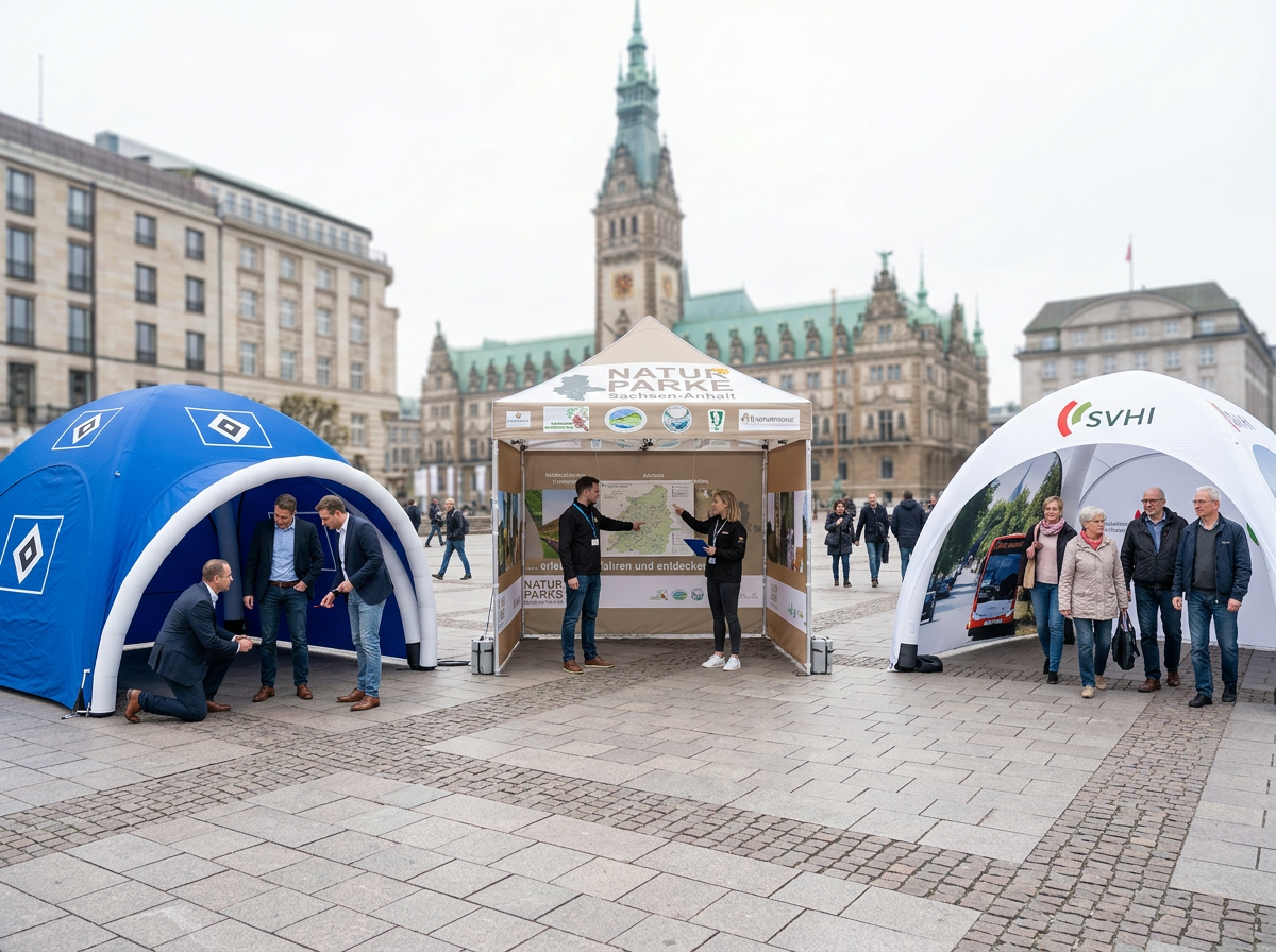 Zwei Personen, unter 5 Minuten: Faltpavillon 3x3m bis 3x6m. Das ist der Standard für Promotiontouren, Stadtfeste, Märkte.